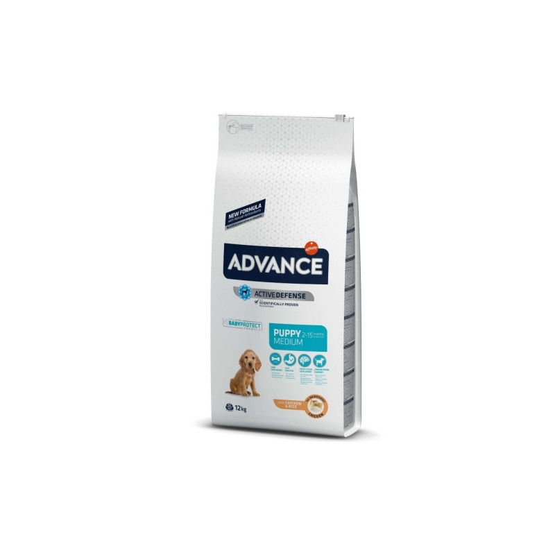 Advance Puppy Protect Medium, es un alimento con nucleótidos especialmente indicado para cachorros de 2 a 12 meses de raza mediana que promueve el desarrollo óseo, cerebral y de la visión, la salud intestinal y el crecimiento óptimo. Alimento de alta gama indicado para cachorros (de 2 a 12 meses) de raza mediana (de 10 a 30 kg. peso adulto) y hembras gestantes o lactantes que incorpora: Exclusiva formula con nucleótidos que ayuda a mejorar la eficiencia de la replicación celular, y facilita el máximo desarrollo de todos los tejidos del cachorro. El efecto potenciador de la replicación celular, permite la rápida activación del sistema inmunitario y eleva el umbral de la barrera inmunitaria contra los agentes patógenos. La incorporación de prebióticos, probióticos e inmunoglobulinas en la fórmula facilita, protege y desarrolla la salud intestinal. COMPOSICION Pollo (20%),arroz (17%),proteínas deshidratadas de ave,harina de gluten de maíz,maíz,grasa animal,proteínas animales hidrolizadas,trigo,pulpa de remolacha,aceite de pescado,huevo deshidratado,levadura,proteínas plasmáticas,cloruro potásico,sal,fosfato tricálcico y nucleótidos.