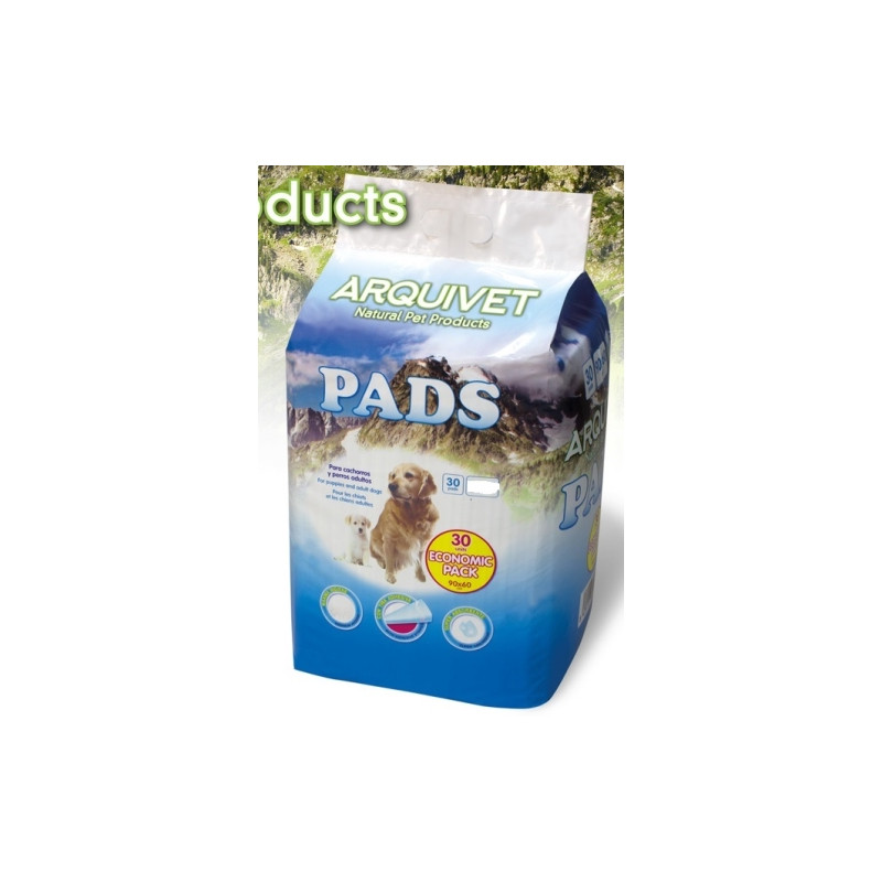 Pads de higiene para ayudar a su cachorro o perro adulto a la hora de educarlo a hacer sus necesidades en el sitio adecuado. Con 30 empapadores por bolsa. Gracias a la pasta de celulosa de alta densidad y las partículas de polímero super-absorbentes, tiene una muy buena absorción. La superficie tiene las vetas claras lo que facilita la difusión de la humedad y su rápida absorción. Los empapadores previenen la fuga de líquidos y mantiene el suelo sin húmedad y sin suciedad. El empapador trae unas tiras adhesivas para que no se mueva del sitio donde usted lo coloque. 30 pads por bolsa. Medidas: 90 x 60 cm