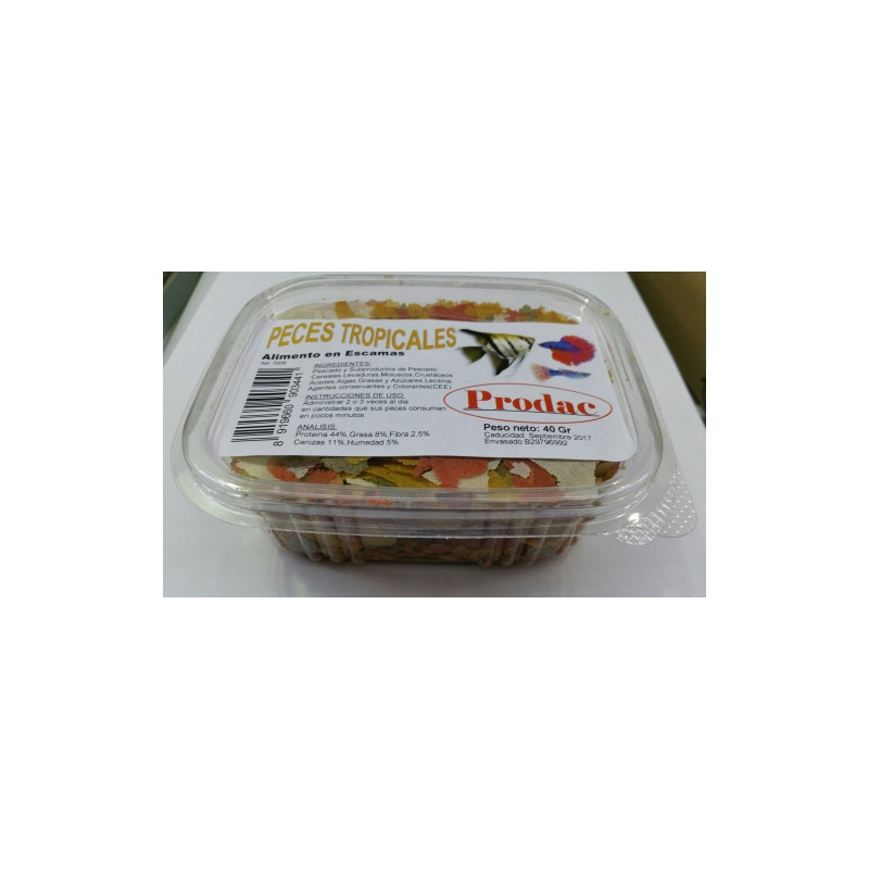 Alimento completo para todo tipo de peces de agua caliente. Ingredientes: Pescado y subproductos de pescado, cereales, levaduras, moluscos, crustáceos, aceites, algas, grasas y azúcares, lecitina, agentes conservantes y colorantes (CEE). Análisis: Proteína 44% Grasa 8% Fibra 2.5% Cenizas 11% Humedad 5% INSTRUCCIONES DE USO: Administrar 2 o 3 veces al día en cantidades que sus peces consuman en pocos minutos.