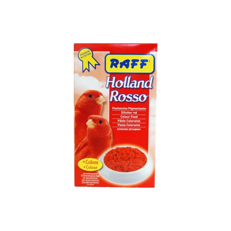 Pasta de cría complementaria para canarios de factor rojo de alta calidad con la garantía de Raff. Producutos de panadería, cereales, aceites y grasas, subproductos de origen vegetal, semillas, azucares, sustancias minerales, leche y derivados de la leche, levaduras, aromas naturales, aditivos C.E.E. Cantaxantina 60mg/Kg.